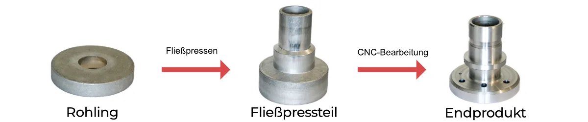 Gegenüber herkömmlichen Zerspanungsverfahren, aber auch dem Alu-Druckguss bietet das Fließpressen gleich mehrere Vorteile:
